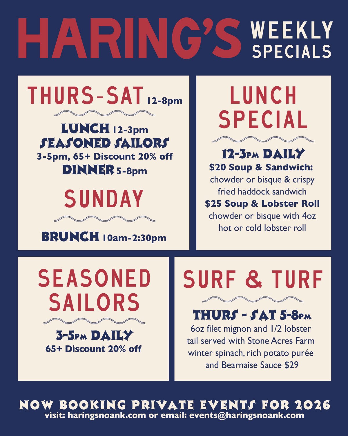 Inspired by a classic New England seafood shack, Haring’s is a waterfront restaurant in historic Noank, offering fresh lobster, smash burgers, seafood, farm veggies and more.